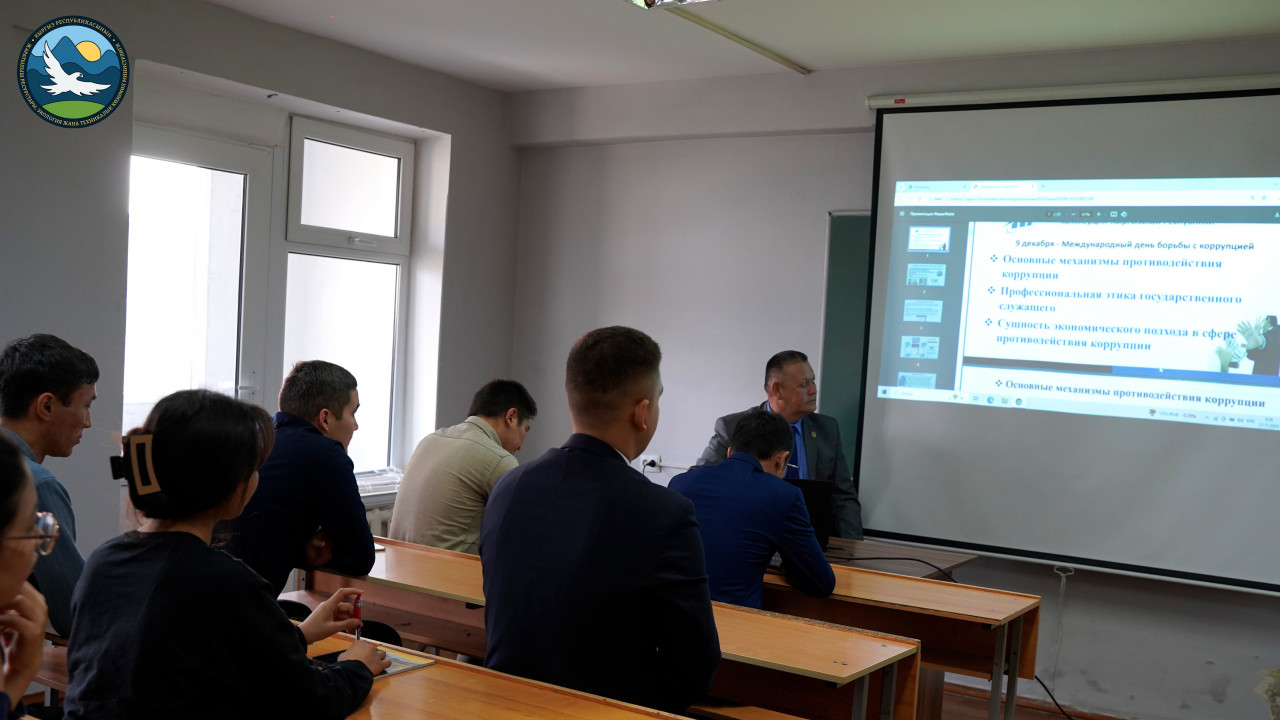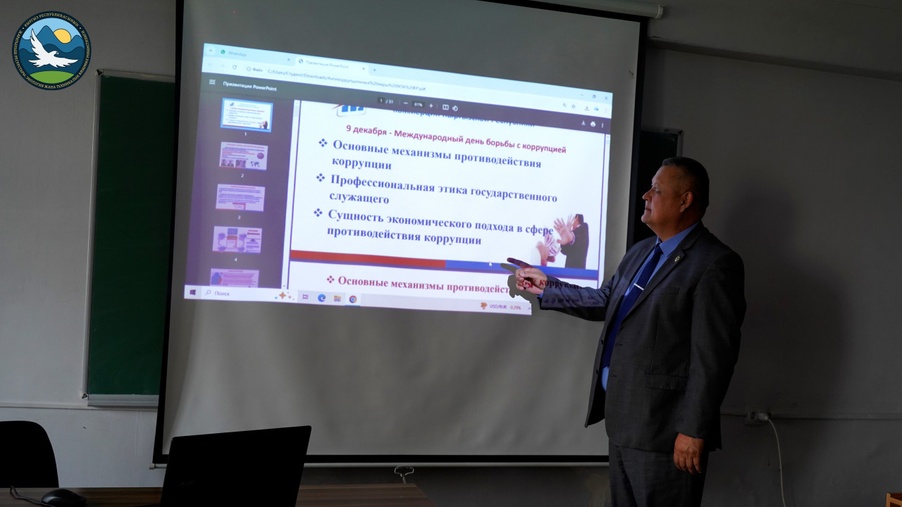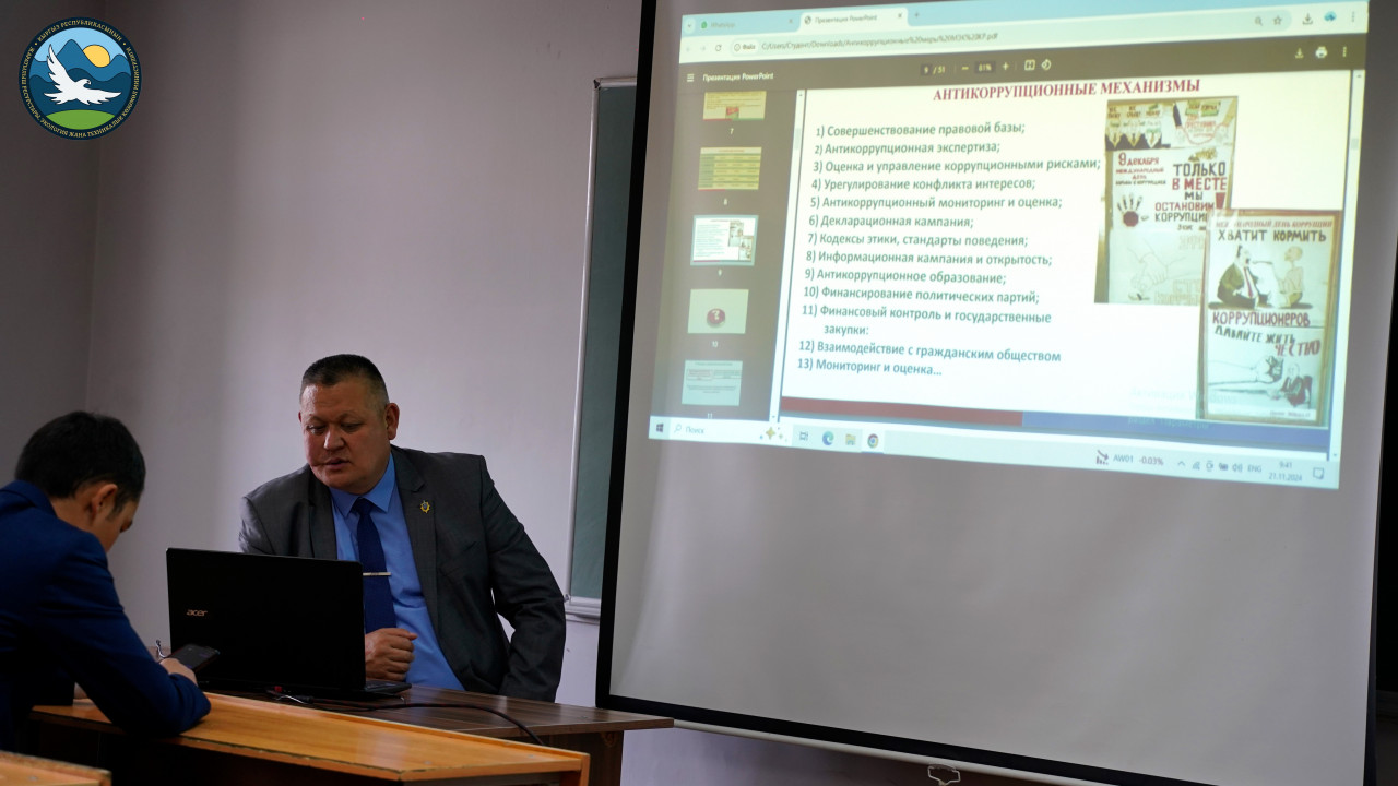 Уполномоченный по вопросам предупреждения коррупции Министерства природных ресурсов, экологии и технического надзора Кыргызской Республики, по совместительству доцент кафедры уголовного права и криминологии Юридического института КНУ им. Ж. Баласагына к.ю.н., доцент Какешов Б.Д., в целях антикоррупционного просвещения провел семинар на тему: «Основные механизмы противодействия коррупции в государственных органах».
