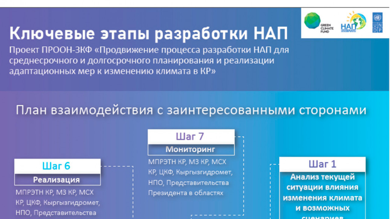 Работа по разработке НАП относится не к одному министерству, это совместная работа нескольких ведомств, отвечающих за определенные сферы жизни в Кыргызстане. А именно: -Министерство природных ресурсов, экологии и технического надзора Кыргызской Республики -Министерство чрезвычайных ситуаций -Министерство сельского хозяйства -Министерство здравоохранения -Центр климатического финансирования