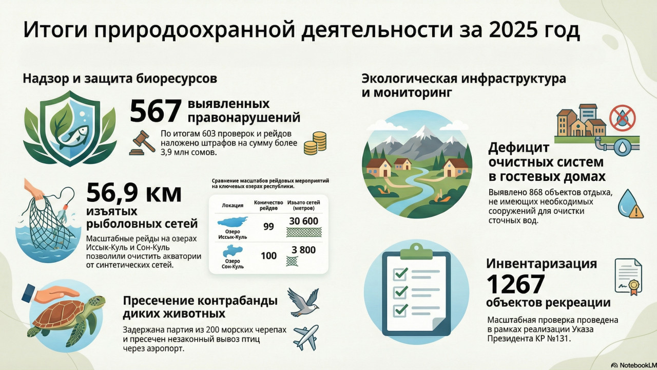 В 2025 году в сфере охраны растительного и животного мира проведено 42 проверки и 561 рейдовое мероприятие. По итогам выявлено 567 правонарушений, наложены штрафы на сумму 3 907 500 сомов, из которых взыскано 3 594 500 сомов.